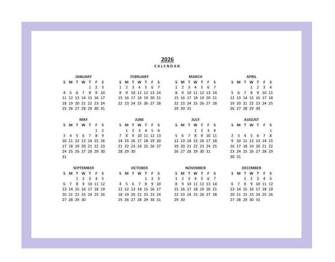2026 Yearly Calendar Printable Sunday Start Year At A Glance Landscape Legal PDF Etsy